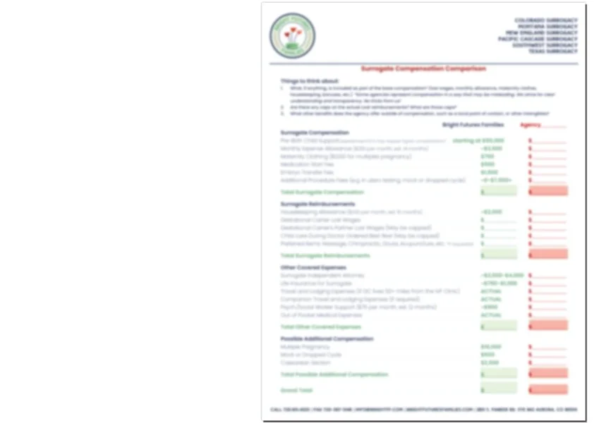 Check out our surrogacy compensation comparison sheet. You can use this sheet to compare BFF with other agencies.