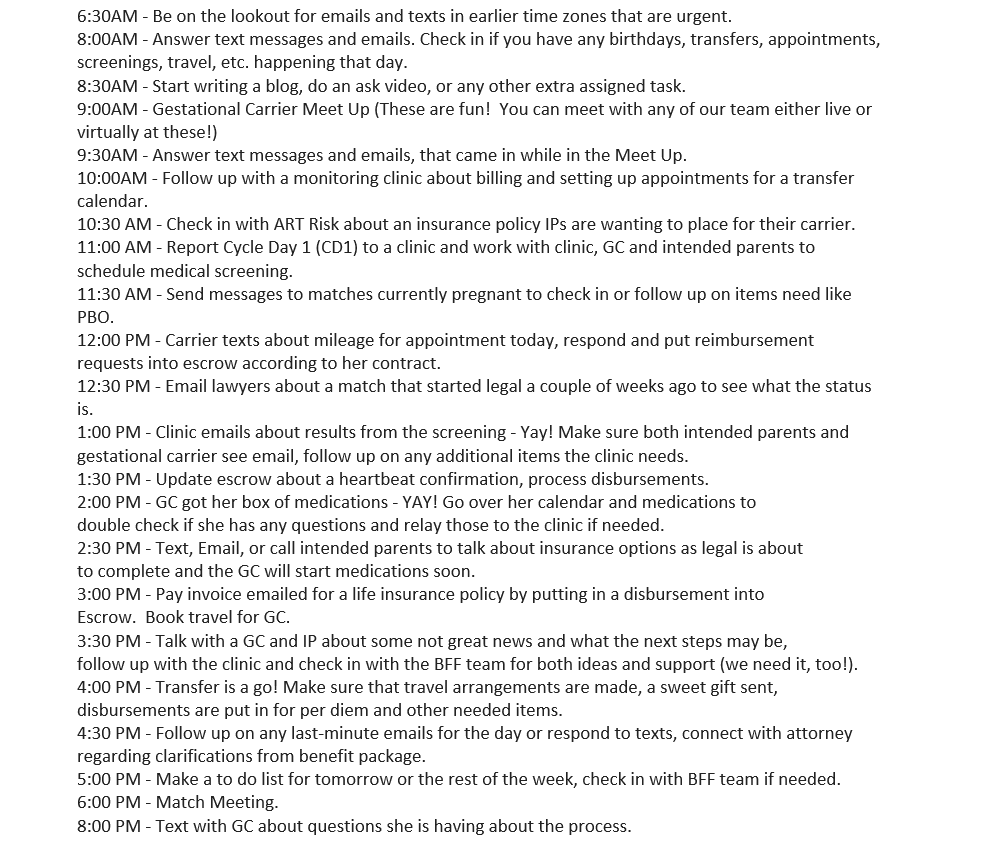 Why use an agency that uses full-service case managers? What does my case manager do every day? Here at Bright Futures Families, we have amazing case managers that handle the gestational carrier and intended parent(s) needs from matching until roughly six months past the birth. We’d love to show you a day in the life of our case managers. Please keep in mind that each day is different as our days will evolve based on what is occurring within each case.